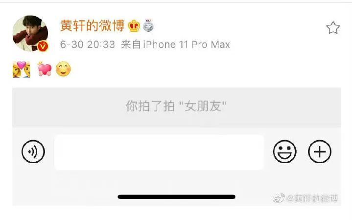 当日晚20:33,黄轩在微博晒出“你拍了拍'女朋友'”的截图大方认爱。之后,黄轩通过工作人员告知大家,女友是圈外人,希望不要打扰到她。