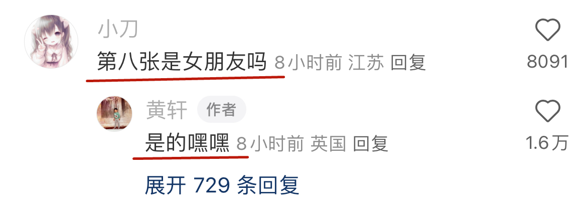此举引发有网友猜测,网友“小刀”在评论区发问:“第八张是女朋友吗”,黄轩大方回应:“是的嘿嘿”,正式官宣恋情。
