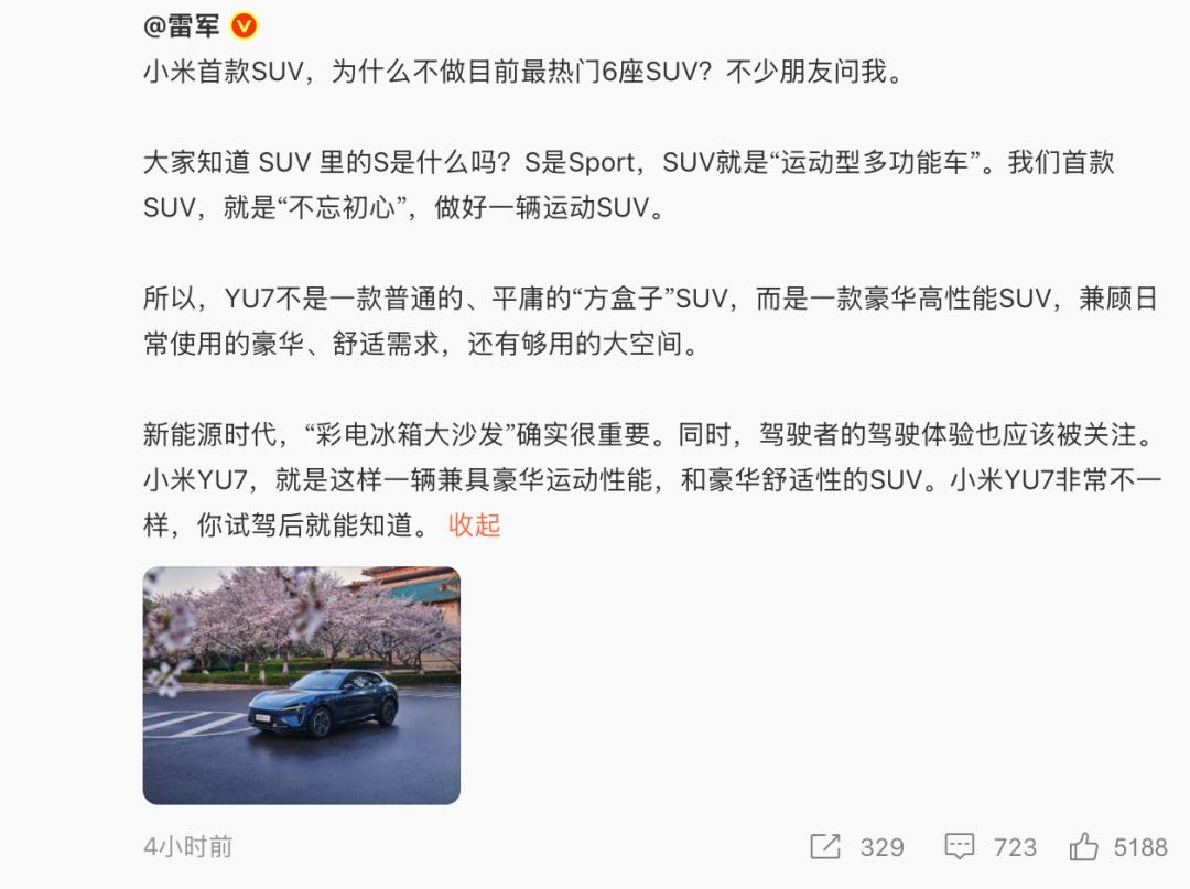 雷军说,小米YU7为什么不做目前最热门6座SUV?答案是不忘初心,做好一辆运动SUV。小米YU7就是一辆兼具豪华运动性能,和豪华舒适性的SUV。小米YU7非常不一样,你试驾后就知道。