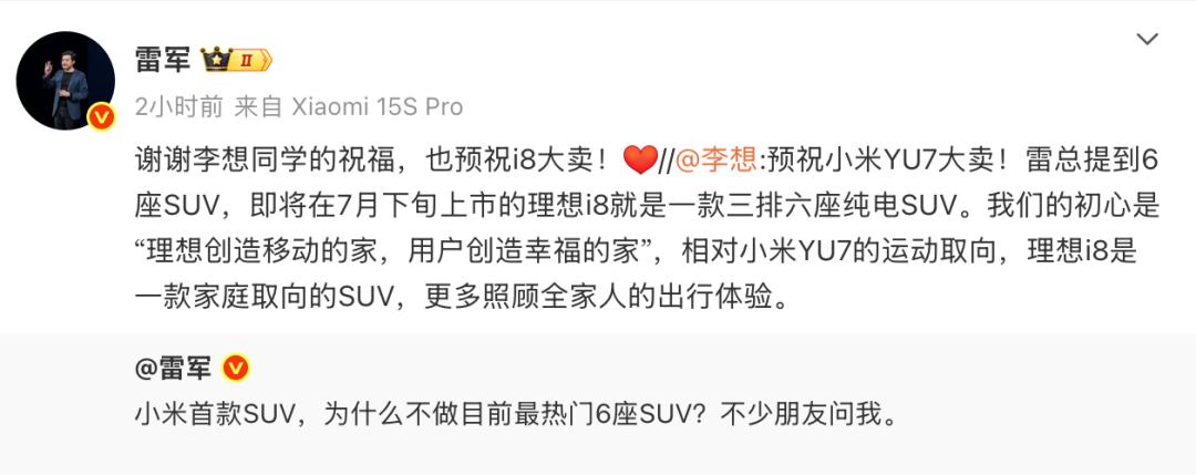 李想转发雷军的微博预祝小米YU7大卖,他说相对小米YU7的运动取向,理想i8是一款家庭取向的SUV,更多照顾全家人的出行体验。