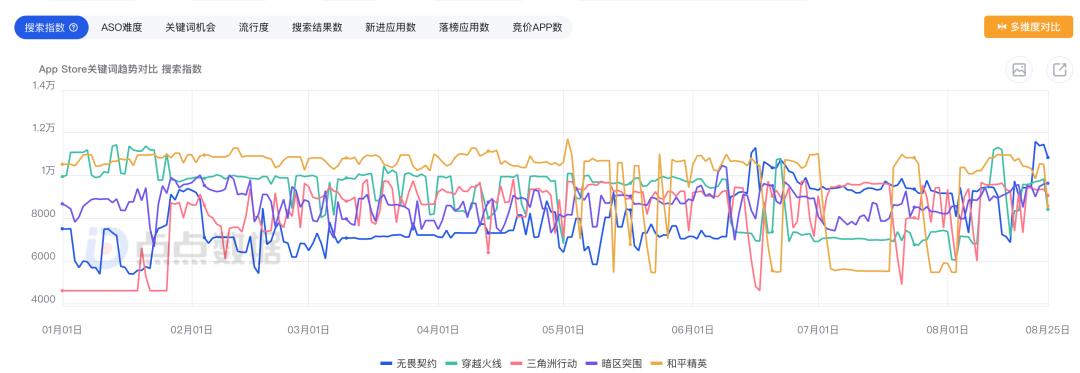 通过点点数据去查看游戏的 AppStore 搜索指数,你会发现无畏契约四个字的搜索指数,在 6 月开始就向上攀升,基本保持在高位。