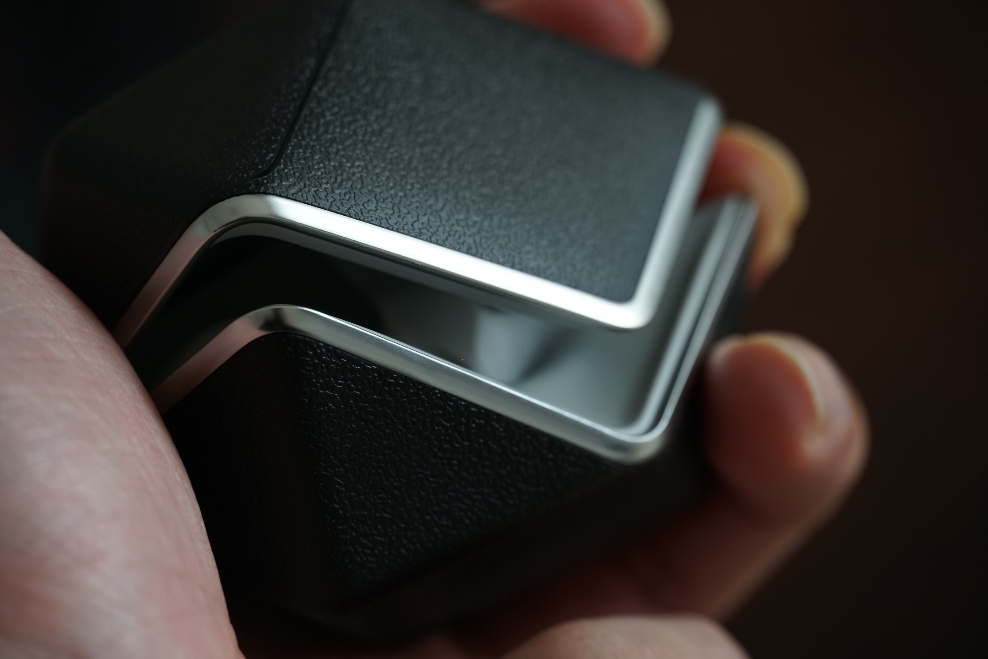 充电仓表层为仿皮纹理,看上去像是切削过的不规则几何体,实际是由多个菱形与三角形切面组合而成。它将此类产品必需的“拿捏取放”体验与艺术美进行了融合,日常体验下来,感觉它融合得还挺不错。