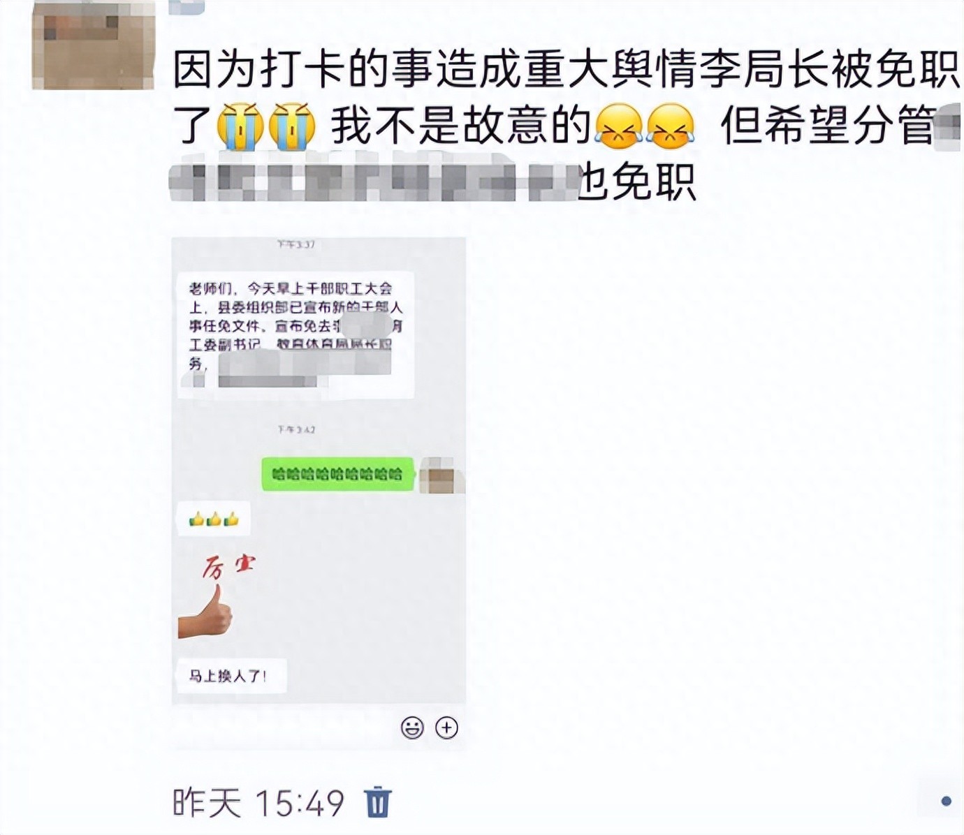 今年9月1日,高光华从一个微信群里面得到消息,时任元江县教育体育局党组书记、局长李某某被免职,他截图后发在了朋友圈,并且评论称:“因为打卡的事造成重大舆情,李局长被免职了。我不是故意的,但希望分管(相关干部)也免职。”