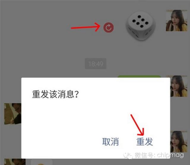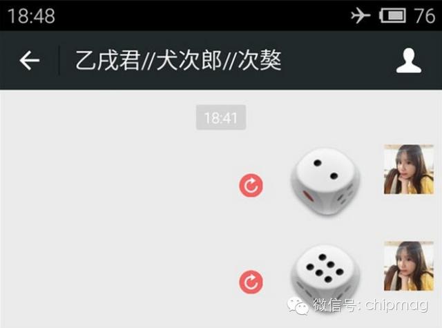 等全部骰子都被标志红色箭头圈圈时,关闭飞行模式,像别人发起玩骰子挑战吧!他摇出5点,你就从刚才发送失败的骰子中选一个6点的,点击红色箭头圆圈标志,确认重新发送。这样一来,对方那边就会在他的5点骰子之后,显示出你发送的6点的骰子。