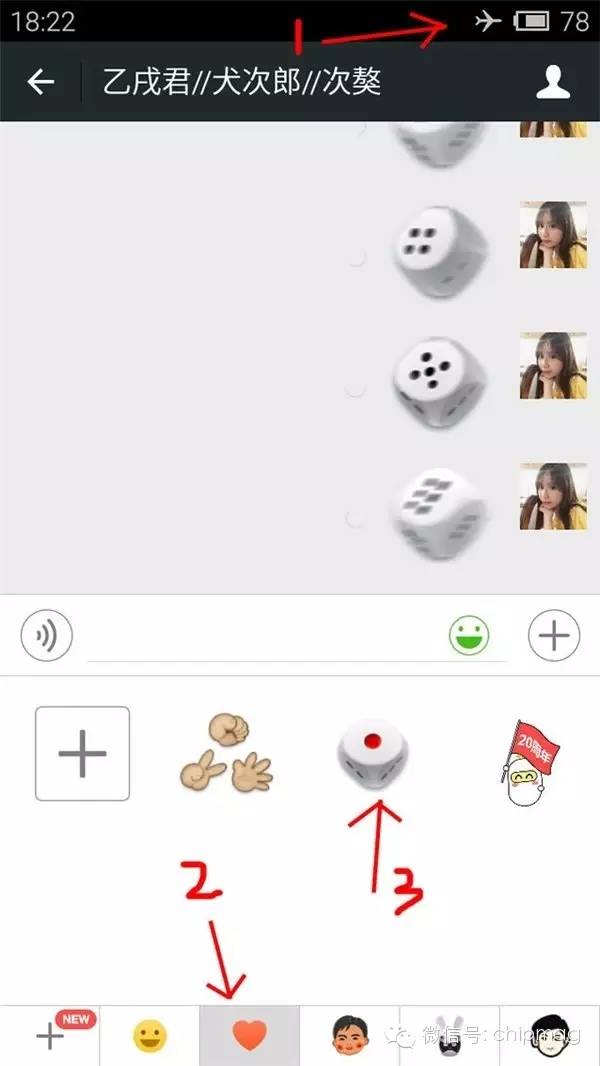 而“摇骰子”必胜法的秘诀就是,先把手机开启飞行模式,之后进群,从微信的自带表情里找到骰子表情,紧接着发送出一连串十几二十个的骰子表情,当然,这些表情都会转一会儿灰色的圆圈,紧接着确定点数之后,再过一会儿(可能要好几分钟)陆续变成红色圆圈箭头标志。仔细观察这十几个表情,如果不是运气太邪门,这些表情里一定会有1点到6点所有数字。