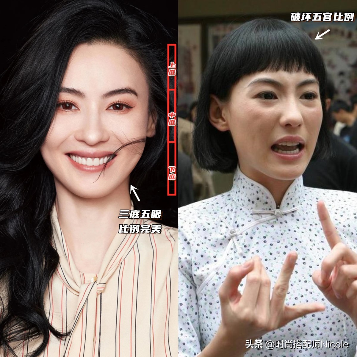 还有像是迪丽热巴、俞飞鸿这样的五官明艳型长相,也不适合留刘海,遮盖额头的刘海会显得大五官更加局促,气场也变得别扭、违和。