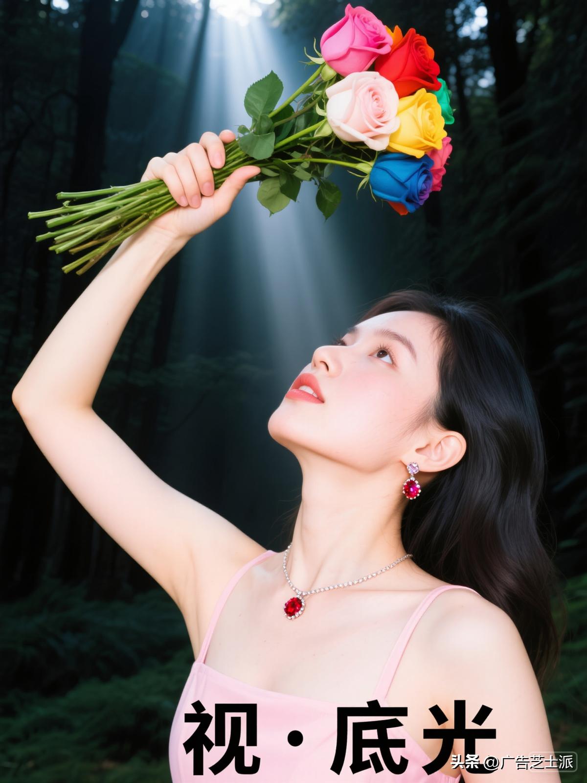 一位漂亮苗条的美女半身照,穿淡粉色吊带裙,戴红宝石项链,红宝石耳环,微笑露出两颗牙齿,手中拿着一束七色玫瑰花,站在暗黑的森林中,丁达尔光,概念光影,多巴胺风格,杰作,实景,相机拍摄,高质量细节,细节生动,用笔灵活,自然之美,大光圈,背景虚化,彩色光斑,中景,32K高清高分辨率