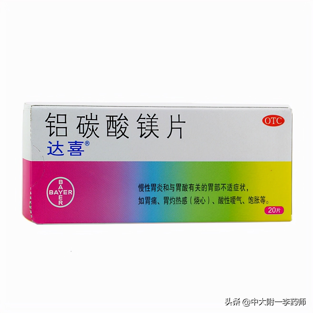 最常见的是护胃药物达喜(铝碳酸镁咀嚼片)、胃舒平(复方氢氧化铝片)、氢氧化铝片、硫糖铝片。