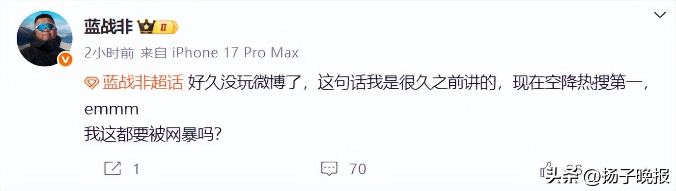 22日中午,“蓝战非”发文称:“好久没玩微博了,这句话我是很久之前讲的,现在空降热搜第一,我这都要被网暴吗?”