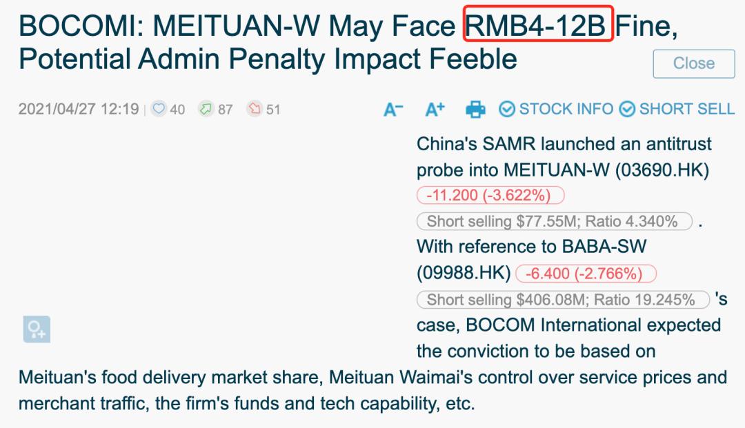由于市场监管总局并未对此次美团被调查披露更多的信息,对于美团的处罚金额业内人士大多以分析为主。