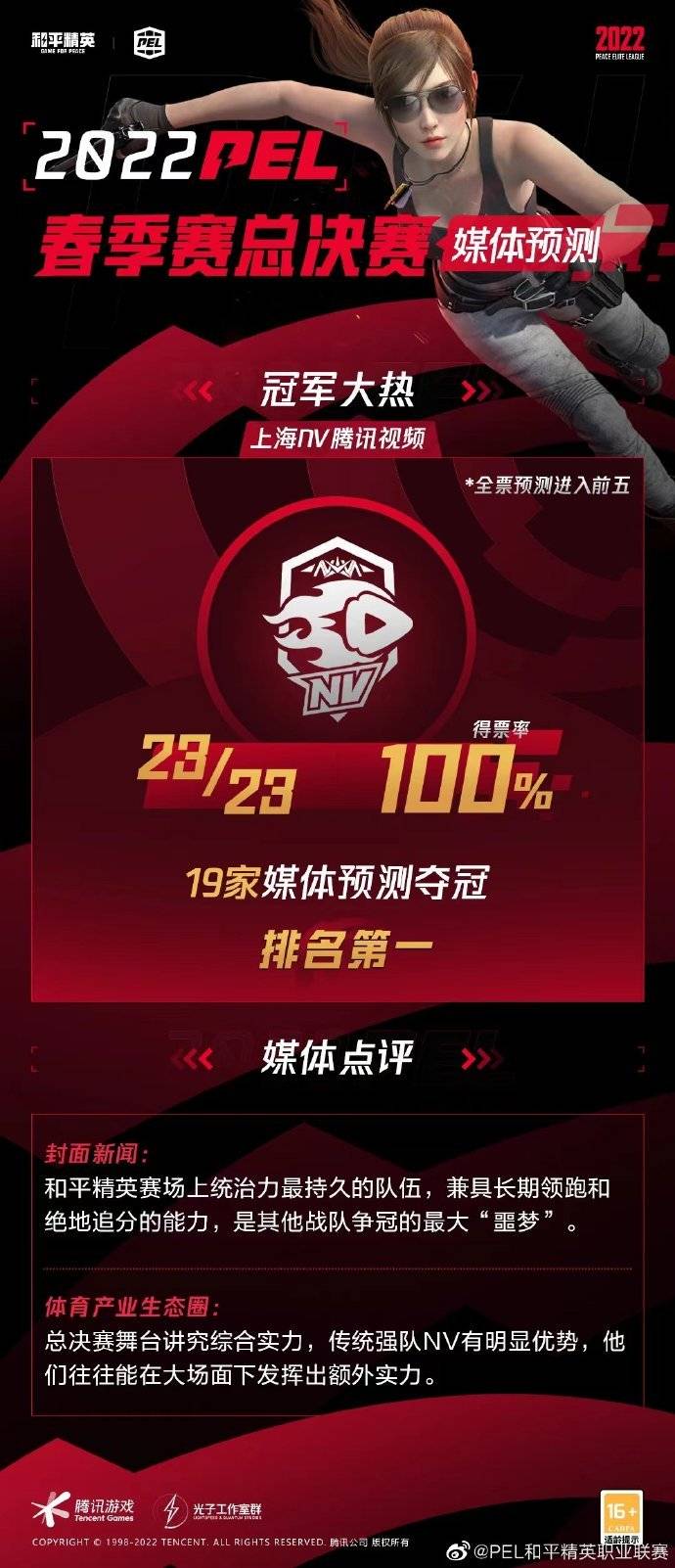 5月16日,2022 PEL和平精英职业联赛春季赛总决赛官方公布了各大媒体预测的总决赛成绩,上海NV腾讯视频被全部23家参与的媒体和机构一致预测可以进入前五,并被19票预测为冠军,广州TC、武汉RSG也被高票数预测进入前五。