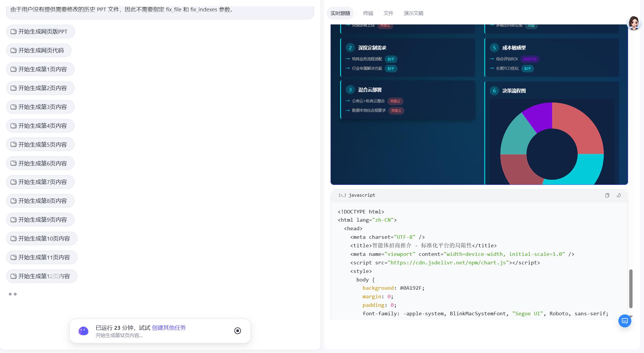 最近智谱升级4.5模型之后,写代码能力是突飞猛进,所以这里的制作ppt仍然是写代码的方式,出来的效果确实是要比扣子空间还要好一些的。