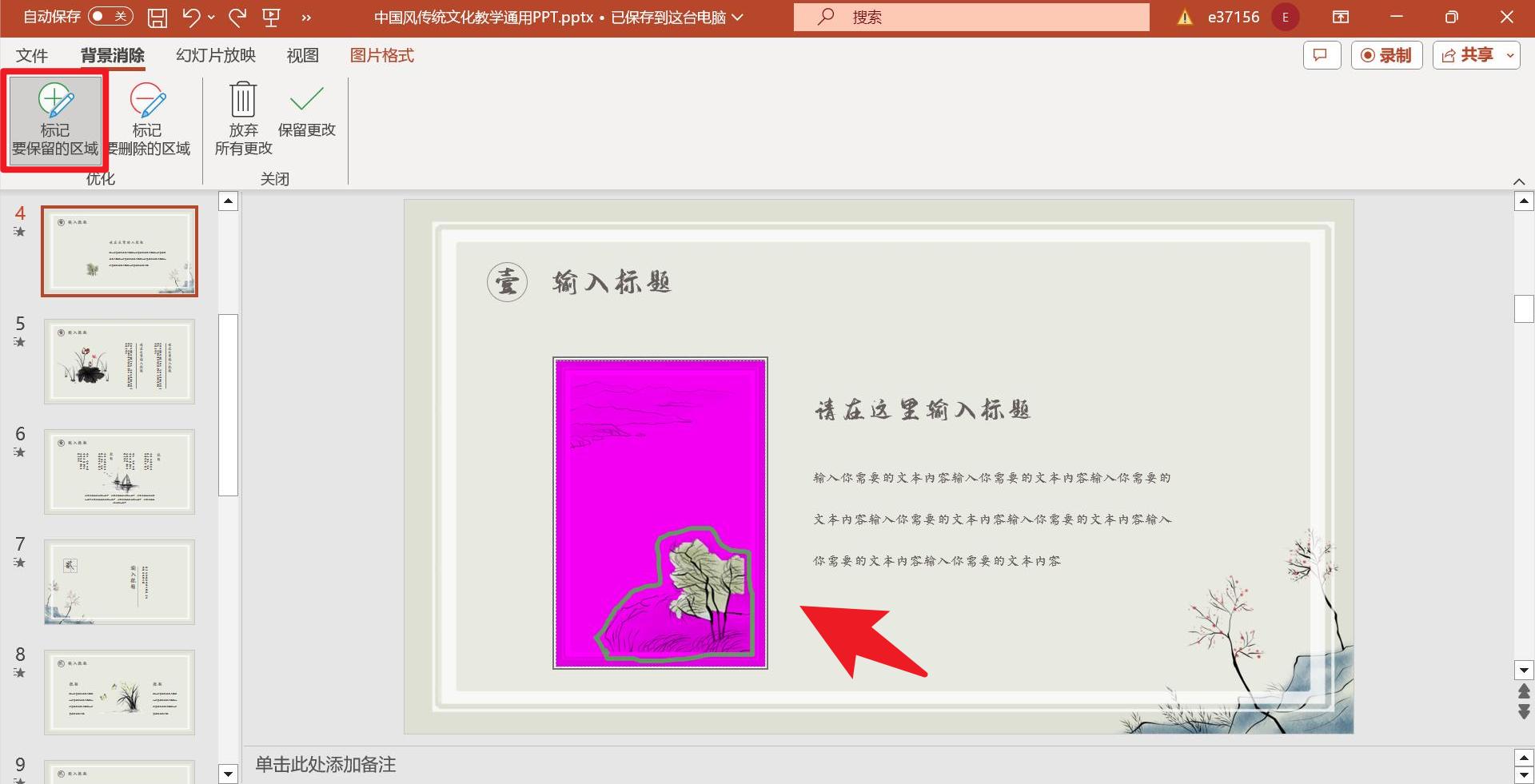 首先,单击【删除背景】按钮,并选择工具栏【标记要保留的区域】;
