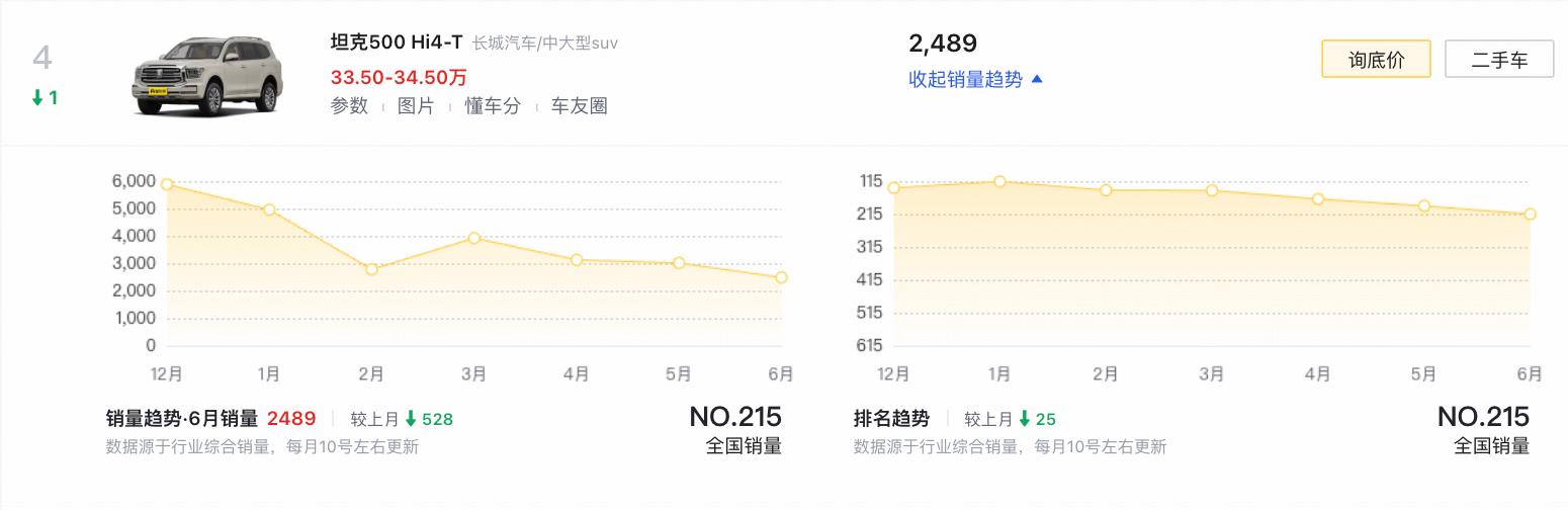 结合动力、价格等因素,新款坦克500 Hi4-Z的主要竞争对手为方程豹豹8(指导价37.98万元起),刚刚发布的福特烈马新能源也会成为其潜在竞争对手。根据懂车帝销量排行榜显示,今年6月,坦克500 Hi4-T/Hi4-Z的累计销量为2489辆。有关新款坦克500系列的更多消息,懂车帝将持续关注。