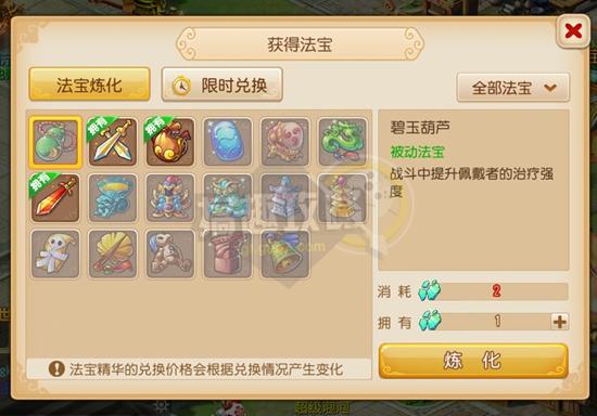除上述的2个法宝必带之外,剩下的两个法宝根据自己的实际极加点、装备特效以及队伍搭配来选择,所有的主动技能无魂傀儡、苍白纸人、乾坤玄火塔、无尘扇、番天印和惊魂铃都可以带,除此之外还有1个增加速度的法宝风袋。