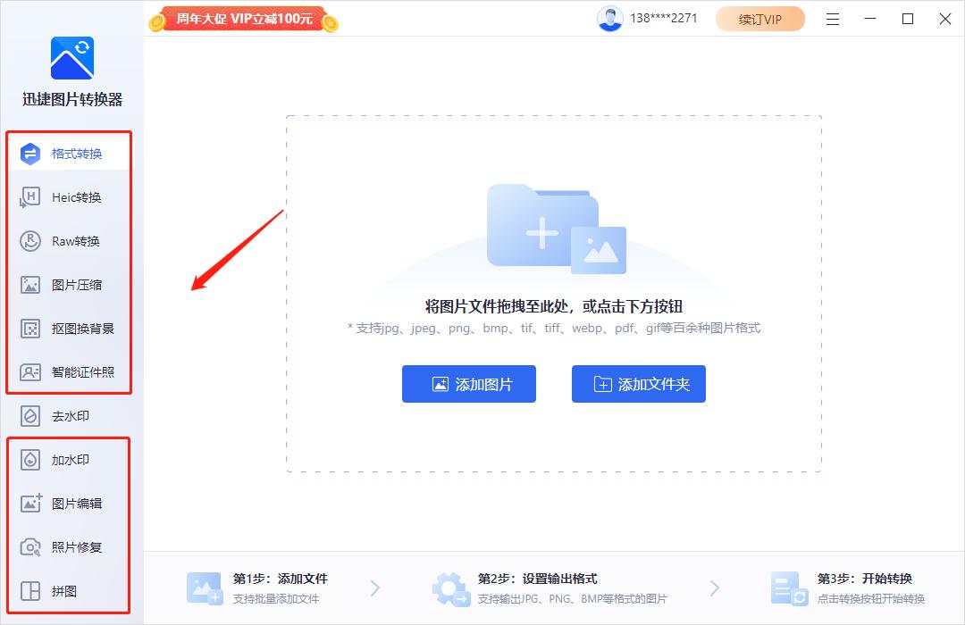 除了去水印功能,还支持格式转换、图片压缩、抠图换背景、证件照制作、图片编辑等多种功能。