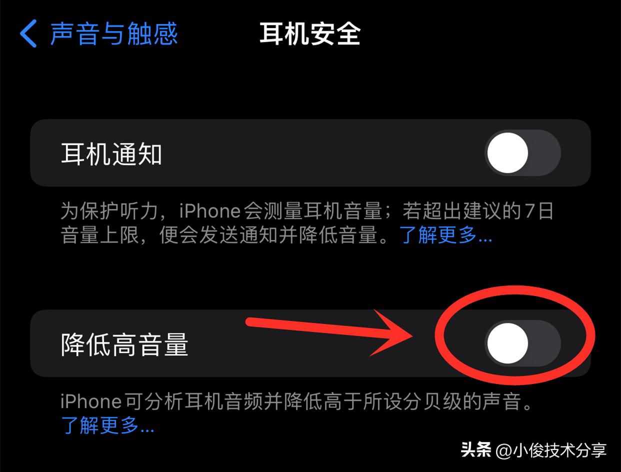 在【耳机安全】中把【降低高音量】开关关掉,关掉之后才不会把声音降低!