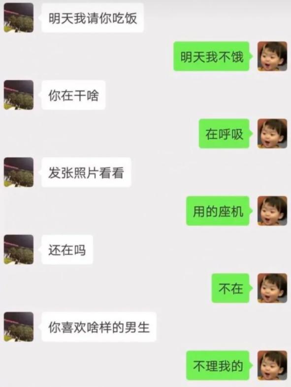 比起关系铁的朋友来说,女学生在面对没感觉的搭讪男时,就显得冷漠多了。面对男生上来就邀请自己吃饭的行为,她直接拒绝道“明天我不饿”,更绝的是在对方要看她照片时,她来了句“用的是座机”。