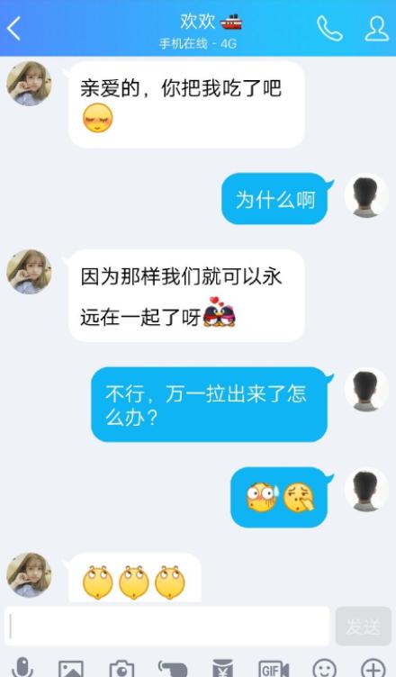 “亲爱的,你把我吃了吧”,看到女友的这个要求,男同学表示实在猜不透。要说不是一家人不进一家门呢,在得知女友的内心想法后,男同学马上回复道:“不行,万一拉出来了怎么办”,这聊天记录不能多看,味道太上头。