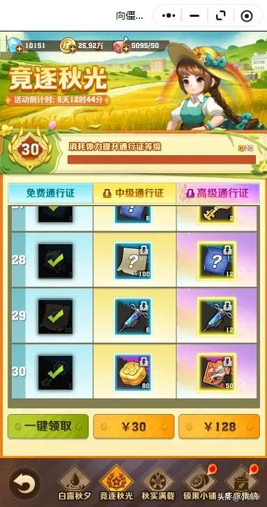 小游戏中还有通行证,三十档位可以获得三百钻石➕一个枪械皮肤➕280镰刀,对于氪金玩家来说,是一个不错的选择。零氪玩家拿免费的道具收割稻谷就行了,免费的镰刀也能收获不错的道具,预计能拿十次抽奖机会。