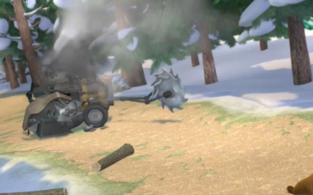 两头熊逃跑时全程无伤,旁边的树木倒是受了无妄之灾——光头强的武器一击就能把树拦腰折断。