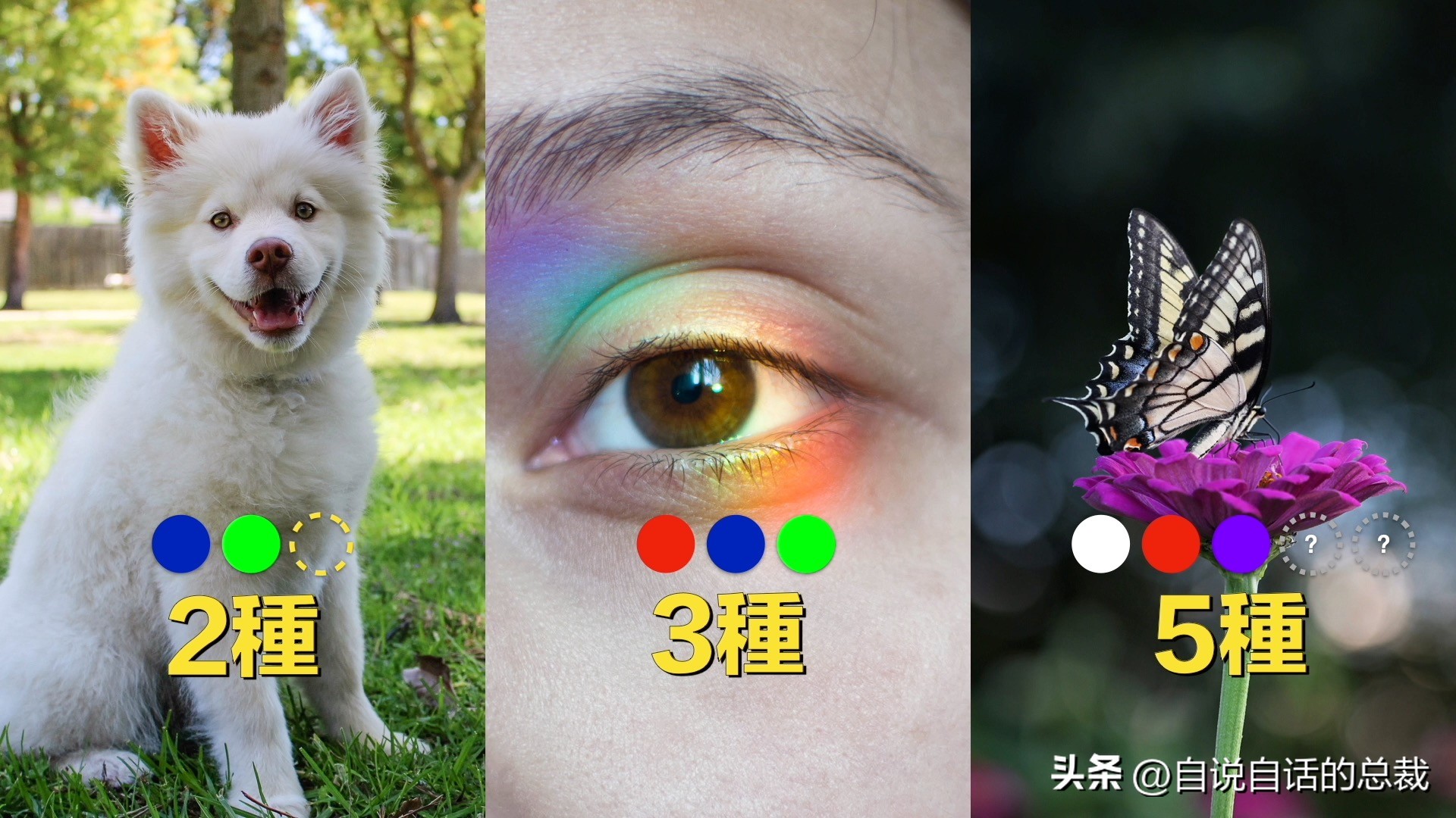 比如,狗,它可以感知蓝色和绿色,还有一点点黄色。
