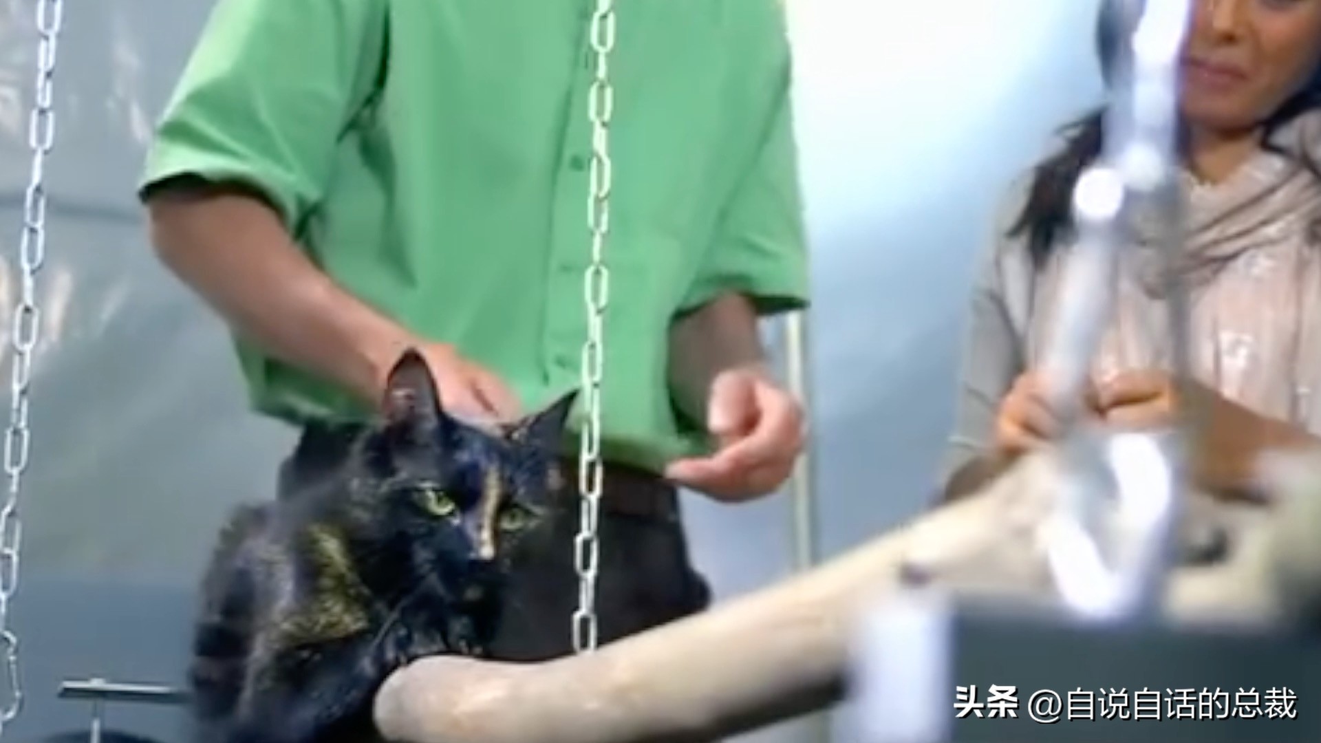 伦敦皇家兽医学院的的实验继续,这次艾伦(Alan Wilson)博士在实验室里一前一后挂了两个小秋千,中间仅用一根形状不规则的木棍连接。