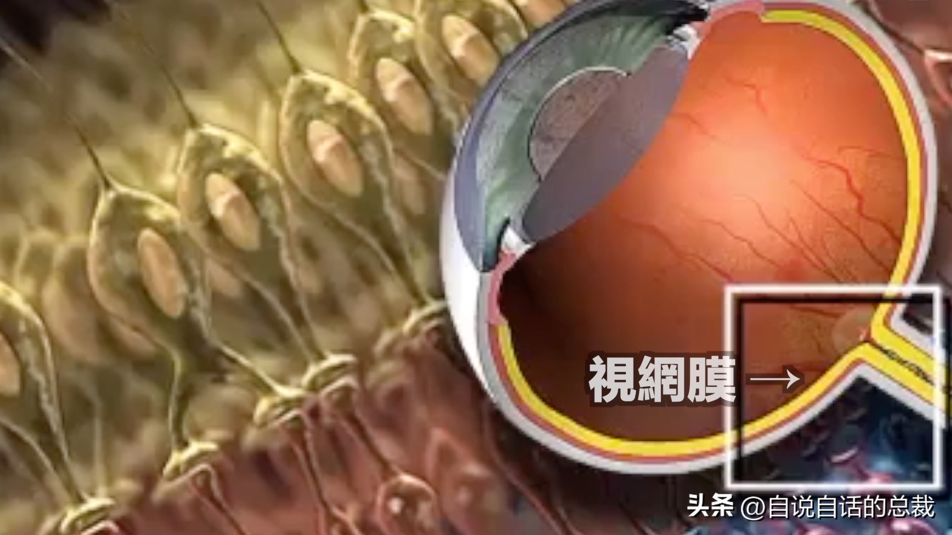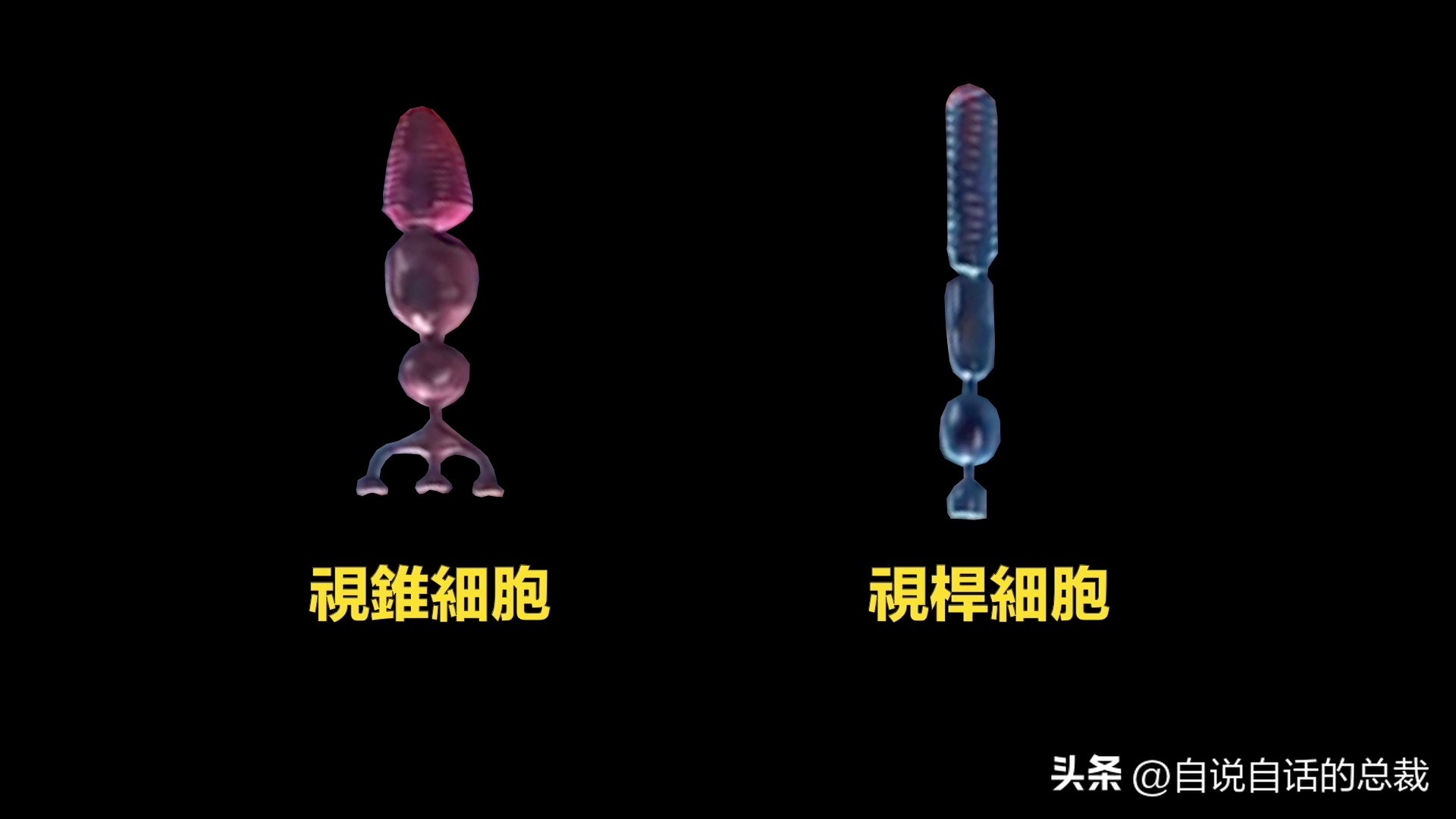 视杆细胞则是,红伞伞白杆杆,橡根蘑菇杆一样。