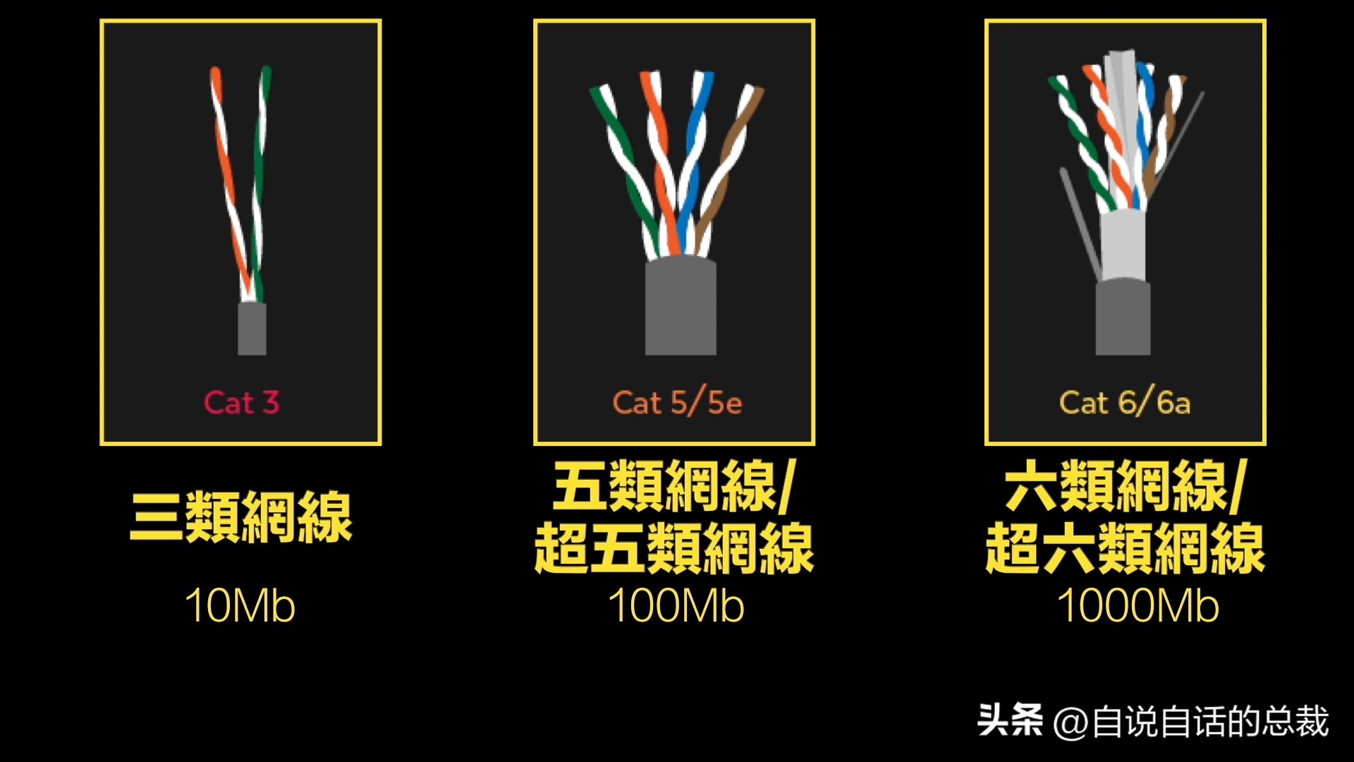 首先,从左到右,依次是三类(Cat3)网线,也叫做电话线,用来传输语音,带宽约10Mb;五类或超五类(Cat5/Cat5e)网线,带宽100Mb,你现在之所以能看到我这段影片,大概率是这种网线在帮你传输数据;还有六类或超六类(Cat6/Cat6a)网线,这是正在普及的千兆网络网线——延迟低、屏蔽好、带宽高,一秒就可以传完我这一整部影片,非常暴躁。
