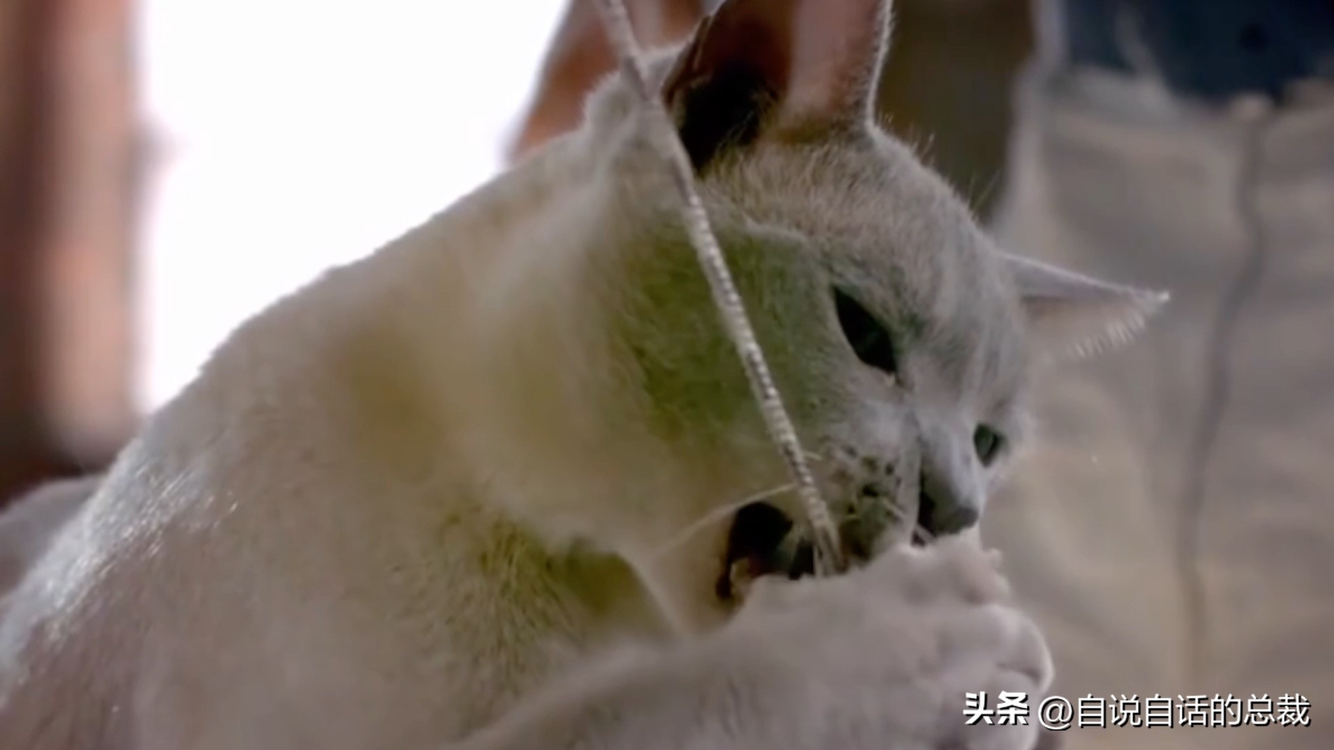 当约翰把逗猫棒放到猫眼前的时候,我们能看到猫猫的眼睛展现出一种“智慧的眼神”,处于一种“放空自己”的状态,原本的一身本领好像失了灵。