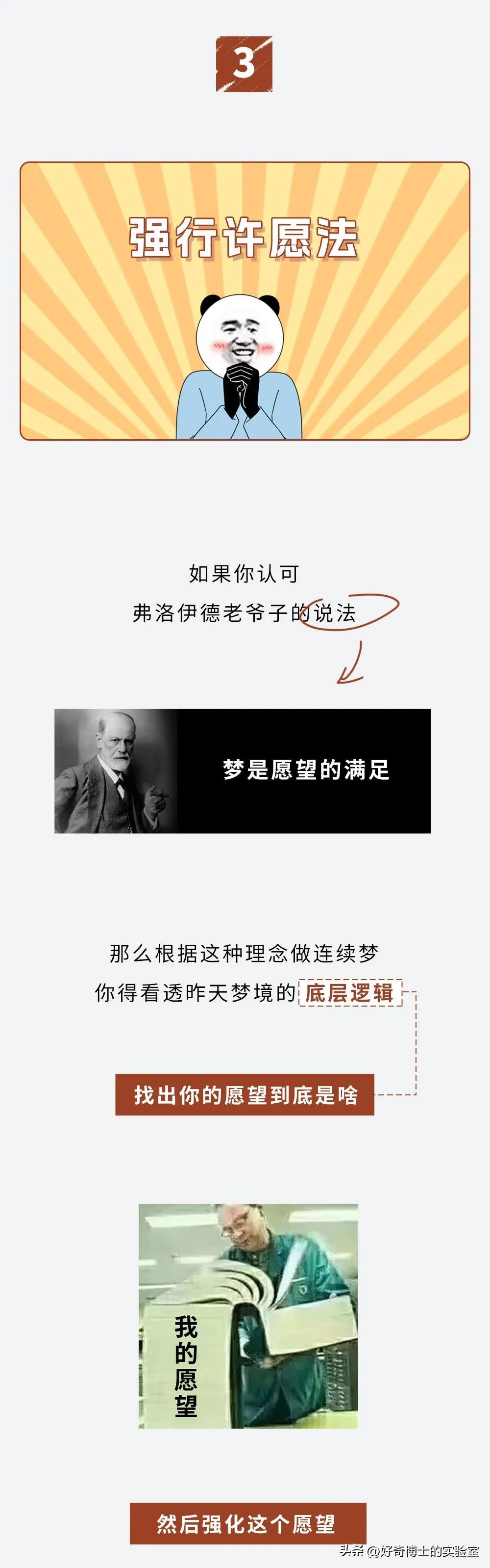 如果你认可佛洛依德的说法:梦是愿望的满足,那么根据这种理念做连续梦,你得看透昨天梦境的底层逻辑,找出你的愿望到底是啥,然后强化这个愿望。