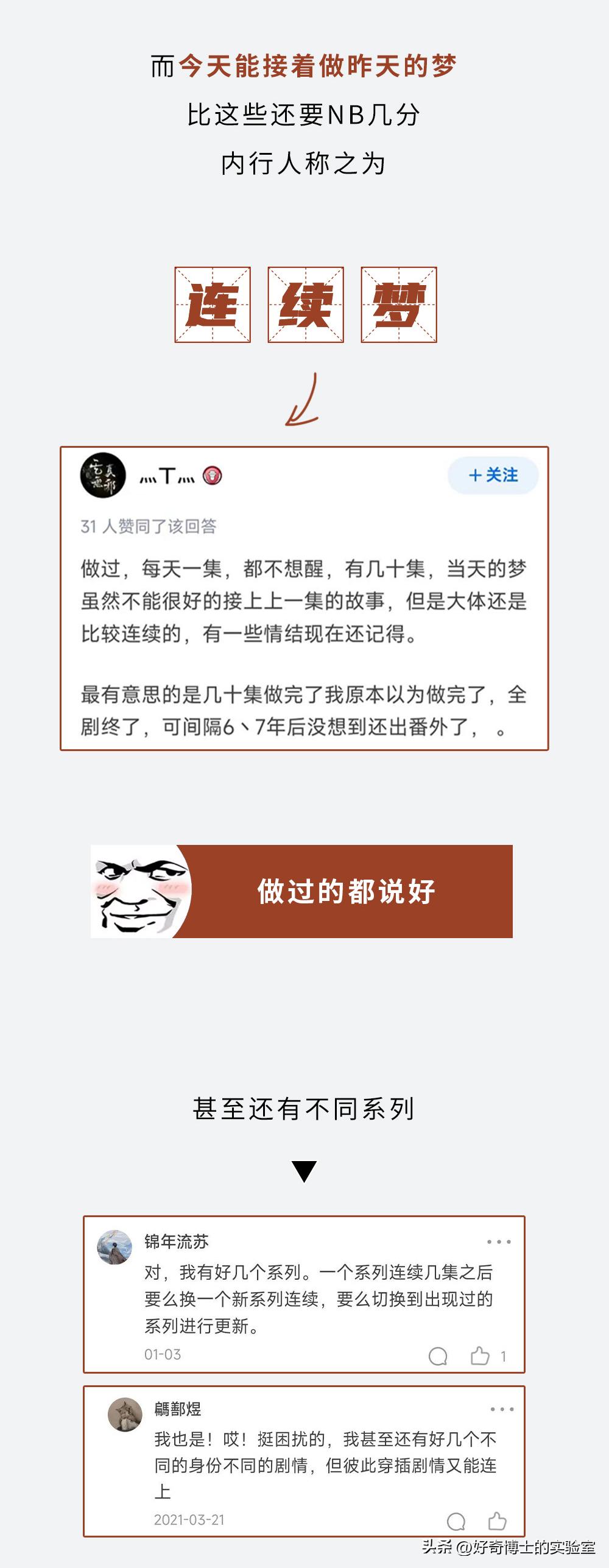 做梦最常见的素材是对某件事的情绪,有研究发现,白天经历的情绪困扰,大概有35%-55%会重现在梦境中。所以要接着做昨天的梦,你需要用强烈、困扰的情绪来召唤它。
