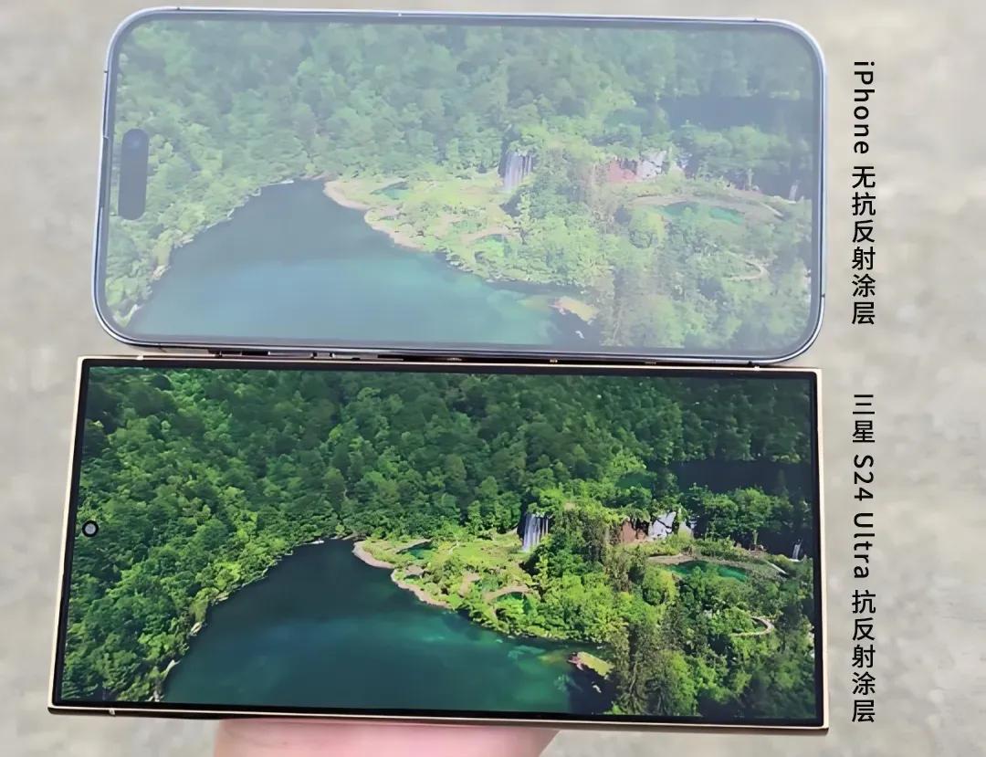 对于用户而言,全新的抗反射涂层在室外使用的时候效果极其明显,拿三星的 S24 Ultra 抗反射屏幕来对比 iPhone 无抗反射屏幕。