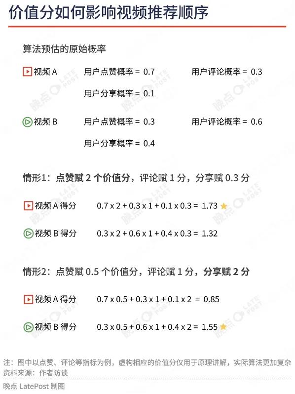 模型估出用户各项行为概率后,还要乘以预先确定的价值分。价值分越高,意味着某项行为越被平台鼓励。相比目标是提高客观预测精度的行为概率模型,价值分更体现平台主观偏好,设定不好,就可能大幅影响平台生态。