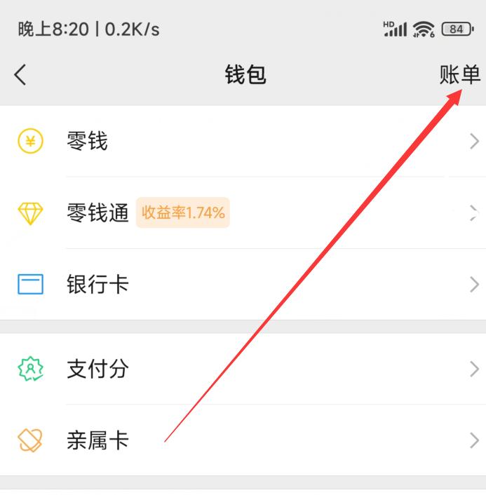4.在钱包页面点击右上角“账单”;