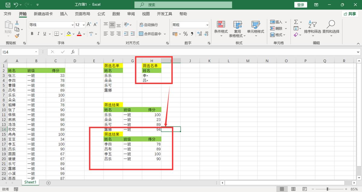 多个姓名筛选时,也可以使用通配符,筛选出符合某一个共同特征的数据,如李姓或吕姓的人员名单,修改筛选条件,同上一样的操作。