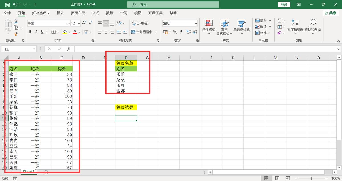 下面我们列一个某校某班的学生成绩列表,一次筛选出多个学生的成绩为例: