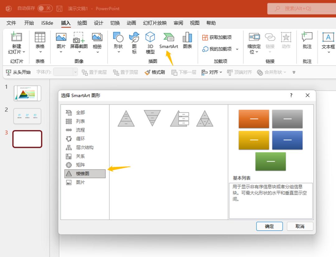 我们的SmartArt图示里面就自带有一些二维的金字塔的结构图,我们打开可以看到。