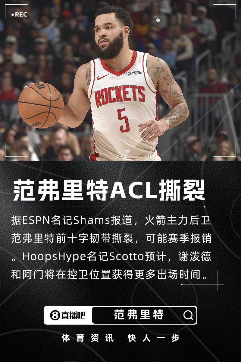 直播吧09月23日讯 据ESPN名记Shams报道,火箭后卫范弗里特遭遇前十字韧带撕裂,可能会缺席整个赛季的比赛。