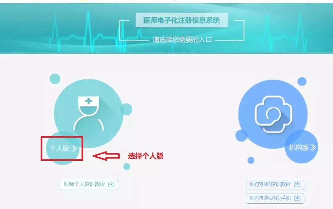 第一步:登陆医师电子化注册信息系统,选择个人版登录。