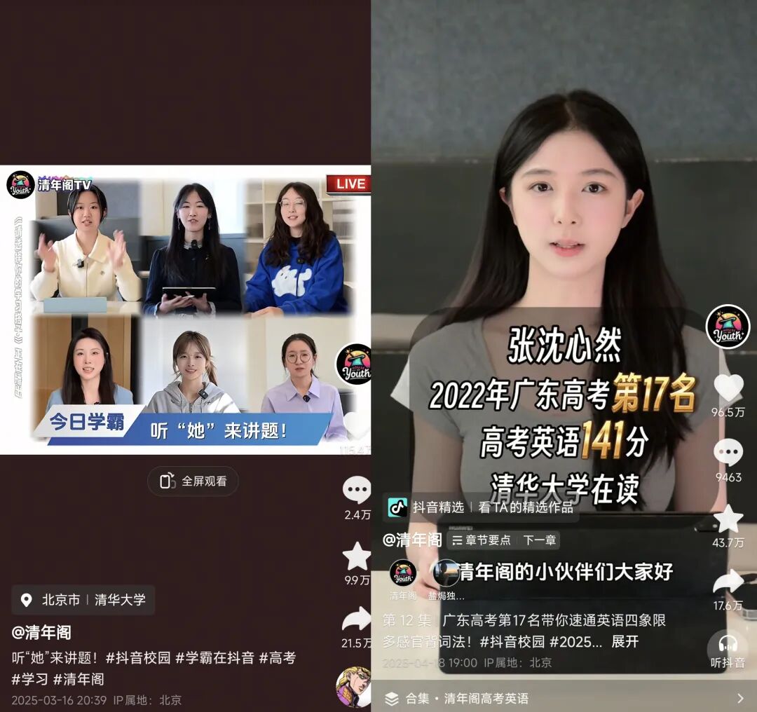 类似的学霸创作者还有“清年阁”。今年高考期间,一条来自清北学霸的高考祝福视频迅速爆红,也让“清年阁”单日涨粉超百万,后续30天涨粉超440万。