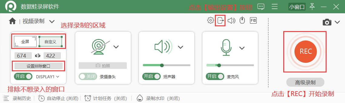 步骤3.在软件主界面,您可以看到多种录制模式,点击左侧的【视频录制】模式,您可以进入【视频录制】页面。接着设置录制的范围,然后点击【REC】按钮进行录制。通过点击页面右下角的【设置排除窗口】,您可以排除不想录入PPT画面的应用页面;