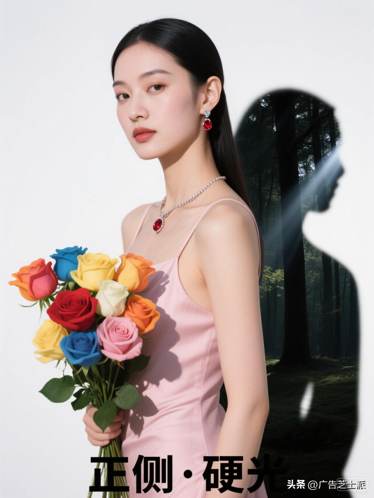 一位漂亮苗条的美女半身照,穿淡粉色吊带裙,戴红宝石项链,红宝石耳环,微笑露出两颗牙齿,手中拿着一束七色玫瑰花,站在暗黑的森林中,丁达尔光,概念光影,多巴胺风格,杰作,实景,相机拍摄,高质量细节,细节生动,用笔灵活,自然之美,大光圈,背景虚化,彩色光斑,中景,32K高清高分辨率
