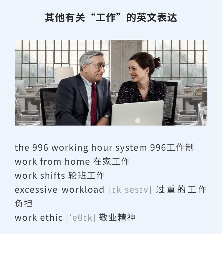 此外,work后面还经常跟一些与工作时间、工作节奏有关的名词或名词性短语,例如: