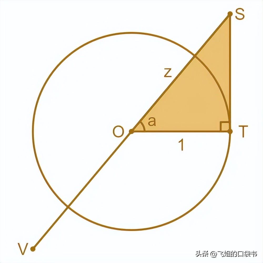 在此图中,斜边SO 的长度为z。邻边OT 的长度为 1,因为它是单位圆的半径。