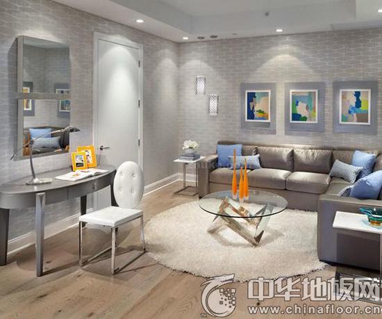 合成纤维地毯呈现毛绒的质感,与银色系渲染的宽敞沙发形成浑然一体的色调。