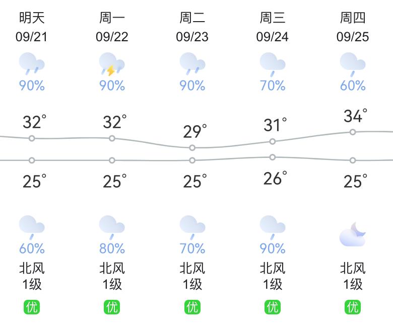 9月21日:多云转阴,有阵雨或雷阵雨,部分中雨,局部大雨。偏北风2~3级,沿海偏北风5~6级阵风7级。火险2级,可燃。气温25~32℃。