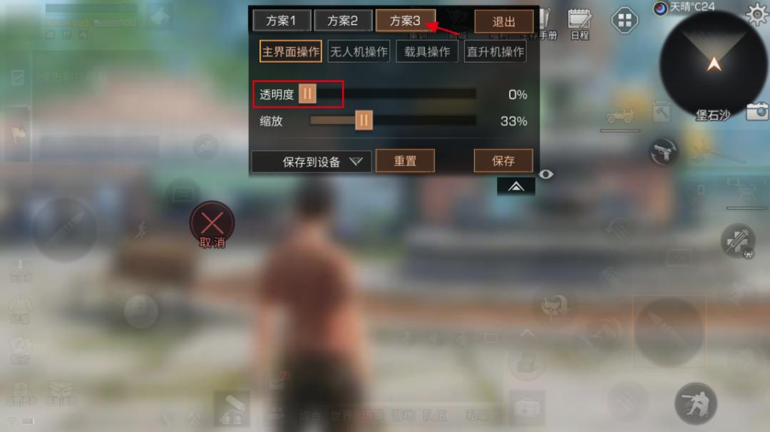 打开操作设置中的自定义控件后,将画面中的所有按钮都调至最低透明度并保存至方案三便于切换。