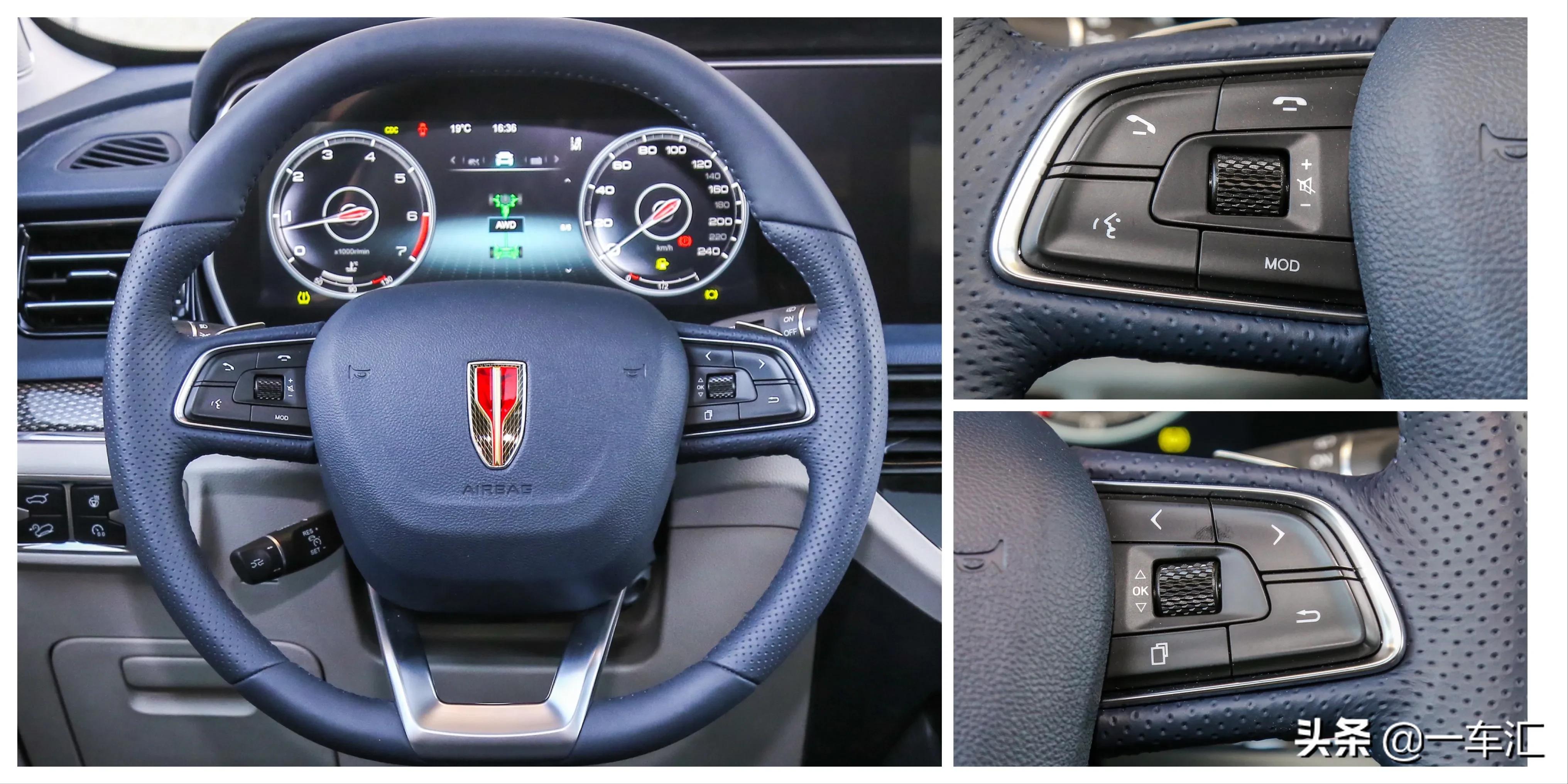 三辐式多功能方向盘造型一般,中间的红旗车标相对更显眼,两侧按键负责行车电脑、蓝牙语音、多媒体调节等功能;全系方向盘握柄处均采用打孔皮质包裹,两款智联旗领版配备了方向盘换挡拨片,且支持方向盘电动四向调节、加热、记忆,其它版本车型均为手动四向调节。