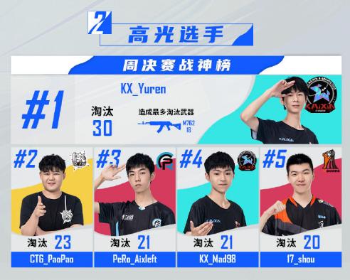不过在数据方面,首周KX和CTG的数据比较亮眼,KX场均击倒和总淘汰是最高的,并且余人也是周决赛的淘汰王。而CTG则是场均伤害最高的队伍,选手泡泡也是登上了战神榜,虽然未能夺冠,但这两支队伍的表现真的很棒!